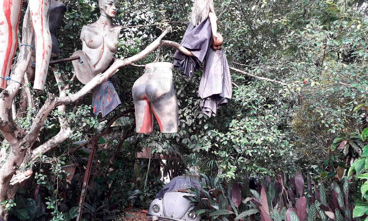 Pintados como se estivessem retalhados, ou assinalados com símbolos místicos, os manequins pendem das árvores do quintal presos pelo pescoço ou empalados nos troncos. Lágrimas de sangue escorrem dos olhos, há talhos nas pernas e nos dorsos. Para alguns, trata-se de um Jardim de Esculturas macabro. Outros creem que é uma manifestação de satanismo.