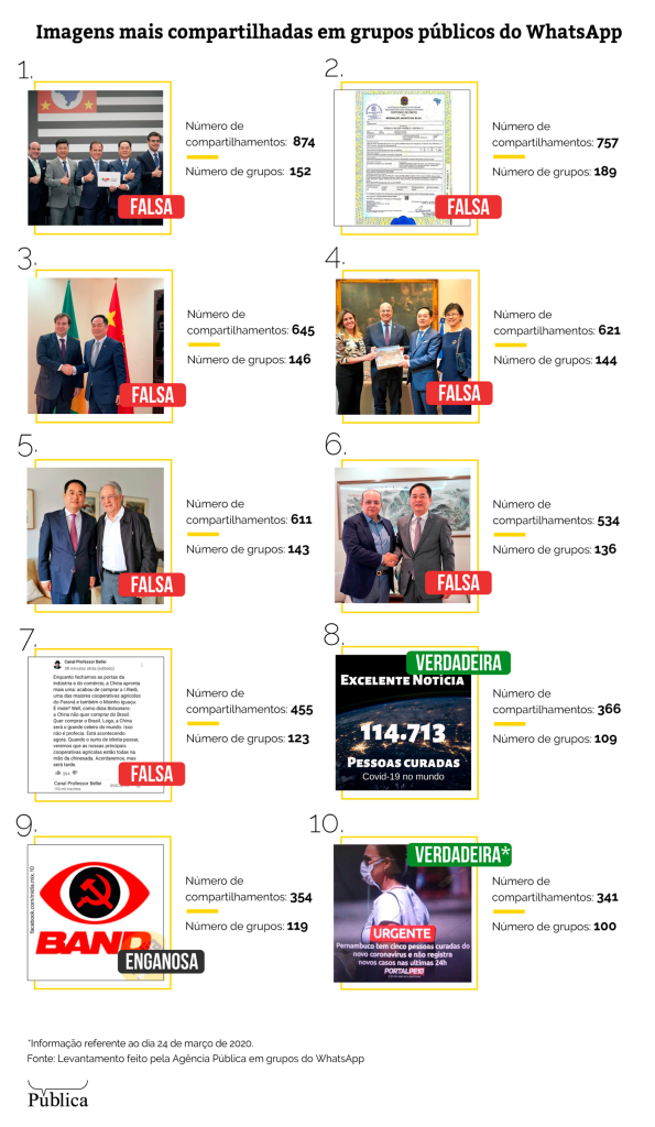 A reportagem analisou as cem imagens mais compartilhadas entre 1o de março de 2020 e 30 de junho de 2020 na base de grupos de WhatsApp do projeto Eleições sem Fake, do Departamento de Ciência da Computação da Universidade Federal de Minas Gerais (UFMG). A amostra inclui 522 grupos públicos de WhatsApp relacionados à política – de diferentes espectros – e mais de 18 mil usuários ativos.