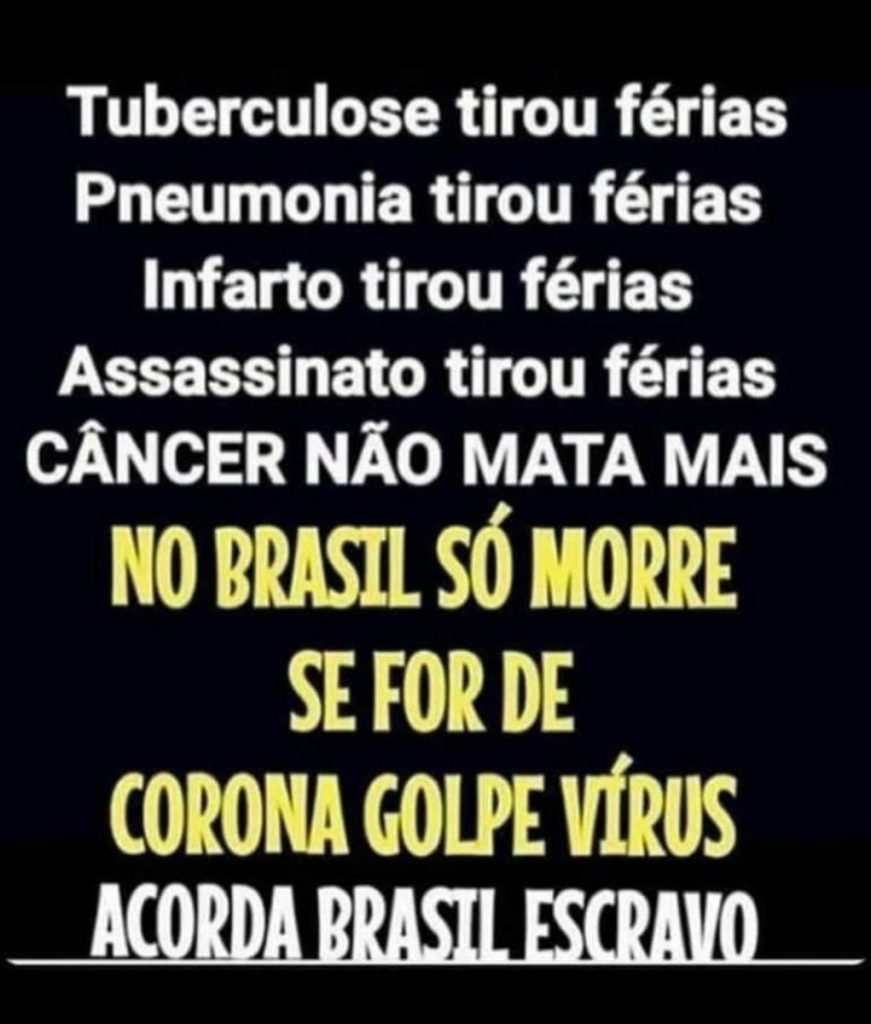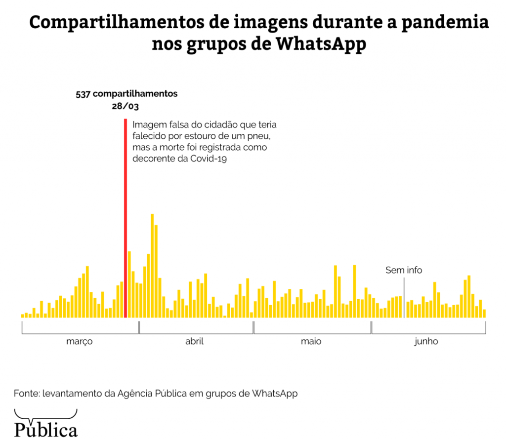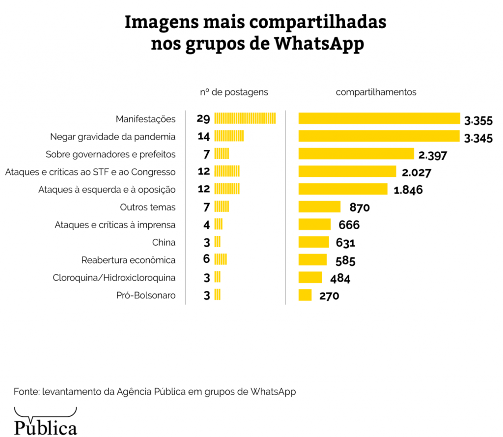 Entre as cem imagens analisadas, 40 trataram da crise da Covid-19 e foram responsáveis por 56,5% dos compartilhamentos. Destas, 14 eram imagens que tentavam negar a gravidade da pandemia no Brasil, insinuando que a taxa de mortes estava inflada ou comemorando o número de curados, sem contextualizar a curva de crescimento da doença.
