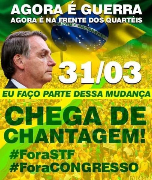 Uma corrente de imagens chamava para manifestações em pelo menos 14 cidades do Brasil nos dias 31 de maio e 7 de junho. Nessas datas, apoiadores do presidente saíram às ruas contra inquéritos no STF que investigavam a disseminação de notícias falsas e pedindo por intervenção militar. “Apoio ao presidente Bolsonaro e às FFAA, Fora Congresso Nacional e STF, Diga não ao comunismo” eram as pautas dos atos listadas nas imagens mais compartilhadas nos grupos.